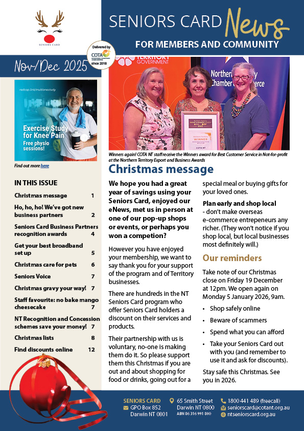 Available via email for current NT Seniors Card holders or online in PDF or flipbook reader (latest edition only)